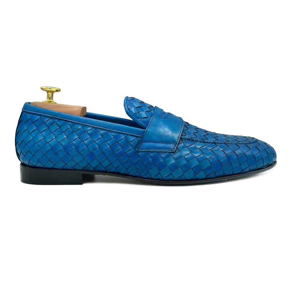 Moccasins in light blue woven leather. Elegant version of the classic moccasins in entirely hand-woven leather. Elegant shoes ideal for completing your look with class on summer evenings. Leather sole.